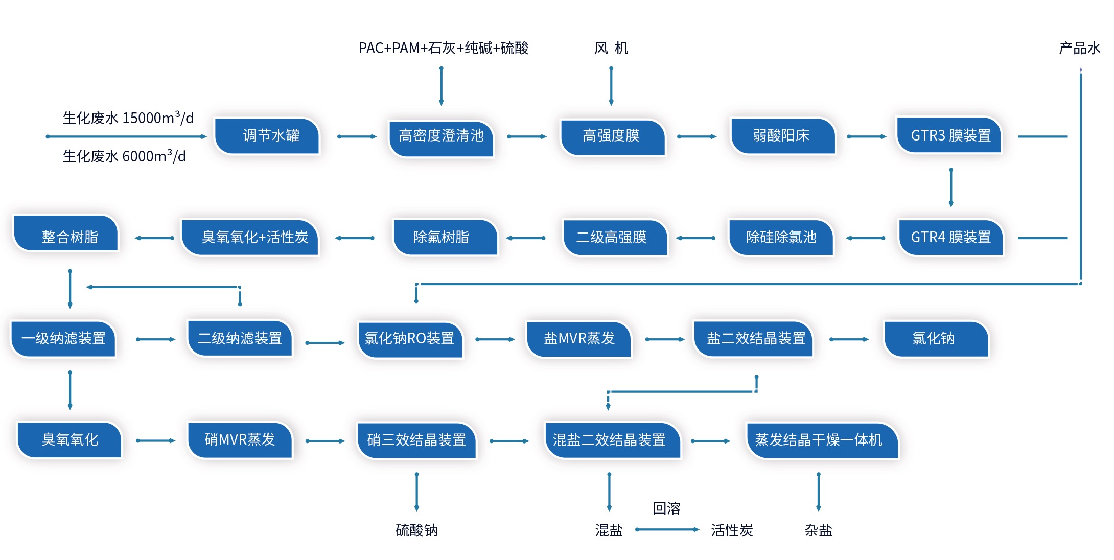 河北协同水处理技术有限公司通过中水回用装置将废水减量化,回收大部分水。剩余的高浓盐水,具有高盐分、高 COD 、高硬度和高含氟等特点,通过“浓盐水水质净化+纳滤分盐+高效蒸发结晶分盐”的组合工艺保证运营达标,结晶盐分别达到了工业副产盐硫酸钠A类一级品和氯化钠工业干盐一级品的标准,在焦化行业真正做到了焦化废水零排放,实现了资源循环利用和经济循环发展。