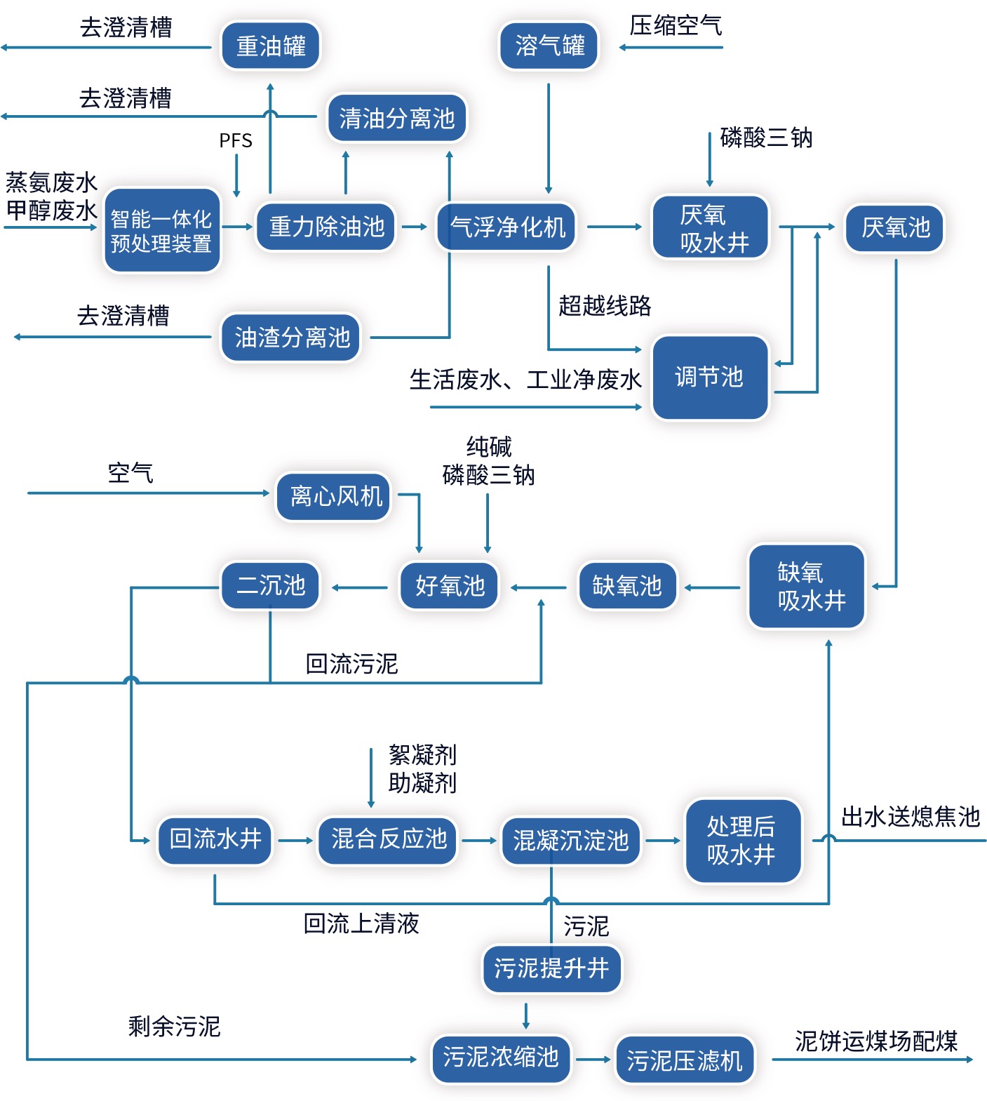 河北旭阳能源有限公司年产焦炭500万吨,污水处理工艺废水处理能力200m3/h,处理装置分为生化处理、物化处理和污泥处理。协同水处理接管运营后对现场进行了包括智能一体化预处理装置投放、缺氧池升级改造、好氧池曝气系统改造等一系列提升,处理后水质指标远低低于《炼焦化学工业污染排放标准》(GB16171-2012)间接排放限值的要求。