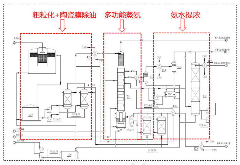 针对蒸氨废水富含 C、N 的特征污染物浓度高、毒性大、油含量高的问题,采用 AspenPlus 计算机辅助设计,开发了除油与无回流蒸氨耦合工艺(如下图)。