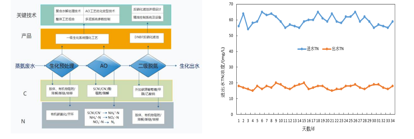 该工艺技术方案中,粗粒化除油器除油效率达到 37%;无回流蒸氨 COD 脱除率提高到 35-40%;氨水浓度提高到18-20%,大大降低了后续生化工艺的处理负荷,浓氨水回用到脱硫塔中,有效提高了脱硫效率,降低了脱硫系统外加碱源的消耗,加大了氨水的循环利用率。